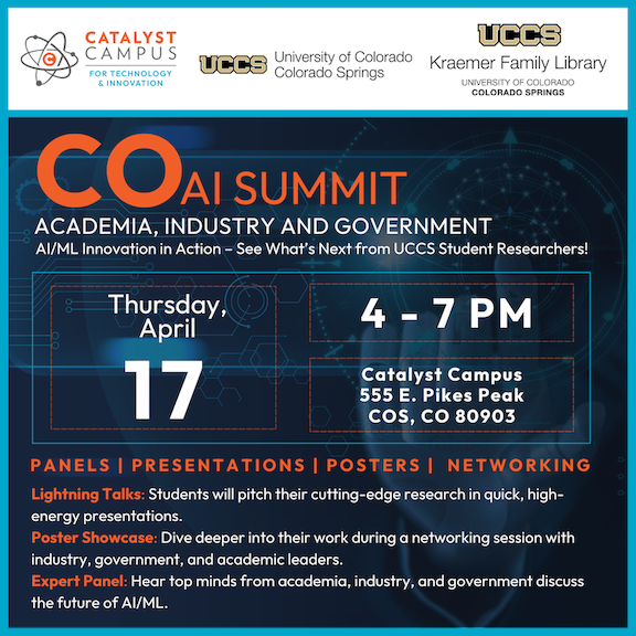 Overview: UCCS in partnership with Catalyst Campus for Technology and Innovation (CCTI) organized an AI/ML event called Colorado AI Summit: Academia, Industry and Government, on 17 April 2025. This event highlighted UCCS AI/ML student research in this exciting field. Estimated Attendance: 90 – 100