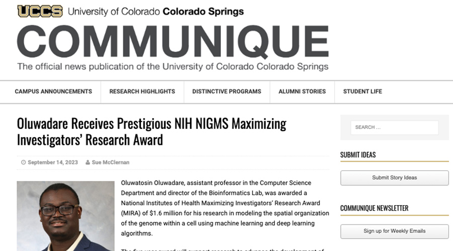 August 18, 2023: Dr. Oluwadare, as PI, Awarded $1.6 million NIH NIGMS Maximizing Investigators’ Research Award (MIRA) for Early State Investigators! Big Congratulations to Dr Oluwadare and Bioinformatics Lab !!!!