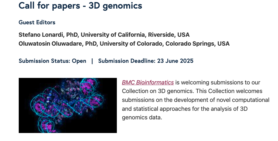 September 2024: I have been invited to serve as Guest Editor for Top Bioinformatics Journal, BMC Bioinformatics Collection on 3D Genomics