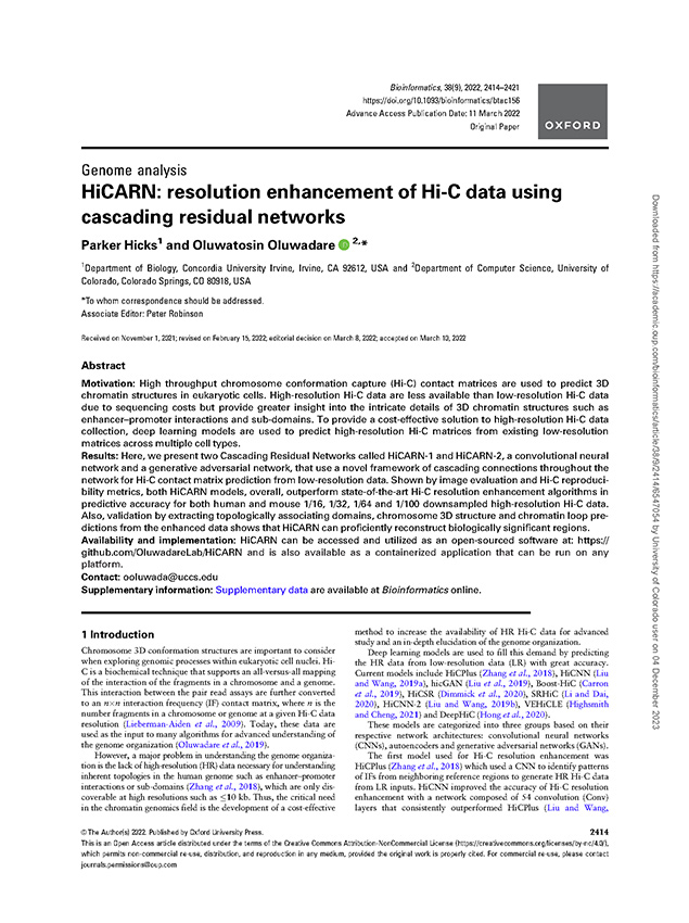 1. Hicks, P., & Oluwadare, O. (2022). HiCARN:Resolution Enhancement of Hi-C Data Using Cascading Residual Network. Bioinformatics. [Won 2nd Place at 2022 President’s Academic Showcase at Concordia University Irvine]
