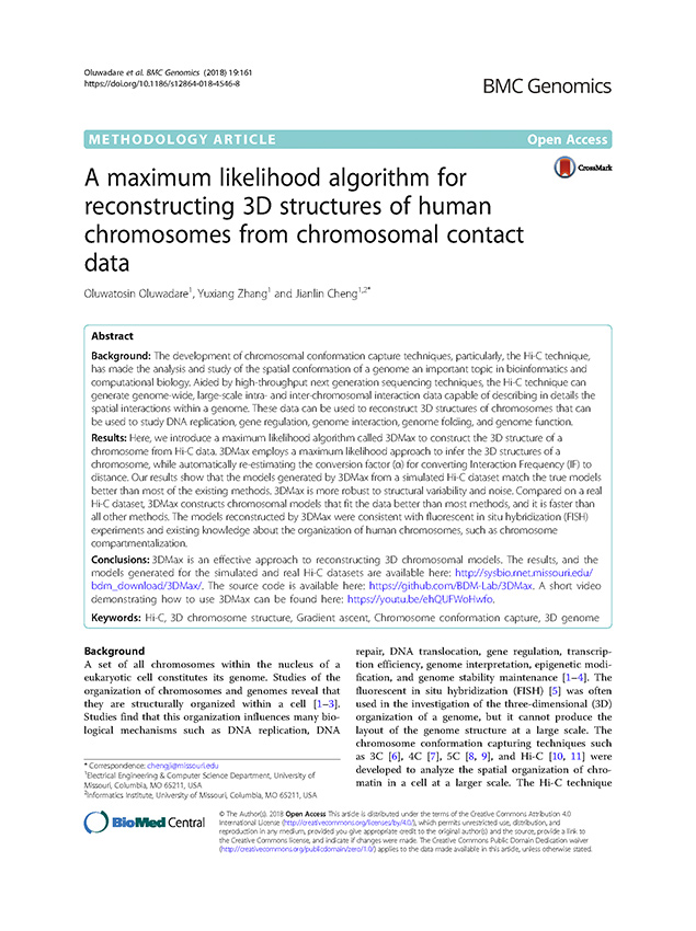 1. Oluwadare, Oluwatosin, Yuxiang Zhang, and Jianlin Cheng. A maximum likelihood algorithm for reconstructing 3D structures of human chromosomes from chromosomal contact data. BMC genomics 19.1 (2018): 161.
