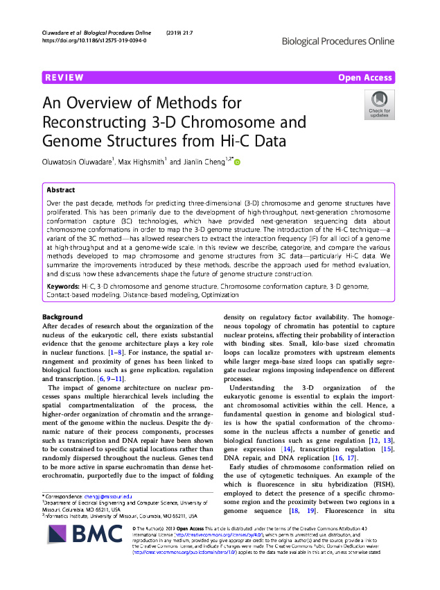 1. Oluwadare, Oluwatosin, Max Highsmith, and Jianlin Cheng. An Overview of Methods for Reconstructing 3-D Chromosome and Genome Structures from Hi-C Data. Biological Procedures Online 21.1 (2019):7.