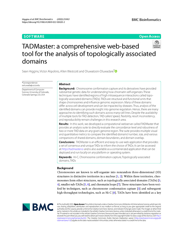 1. Higgins, S., Akpokiro, V., Westcott, A. & Oluwadare, O. (2022). TADMaster: a comprehensive web-based tool for the analysis of topologically associated domains. BMC Bioinformatics 23, 463 (2022).