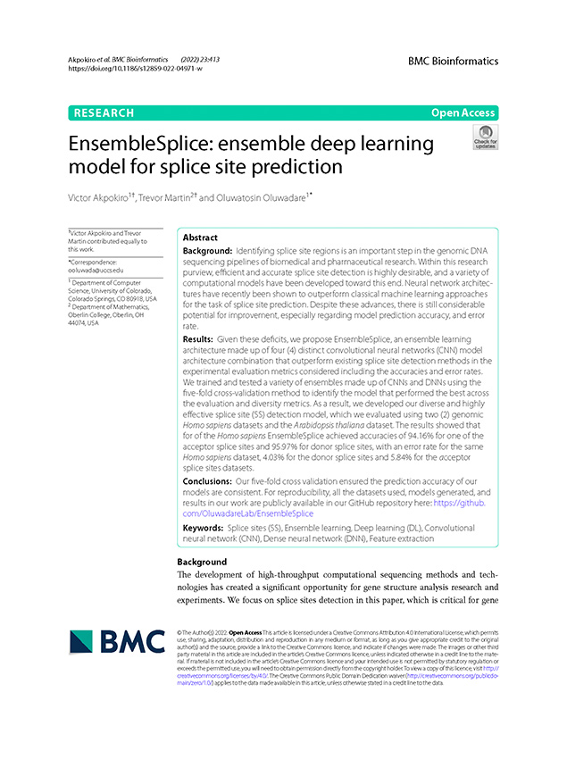 1. Akpokiro, V., Martin, T. & Oluwadare, O.(2022). EnsembleSplice: Ensemble Learning Model for Splice Site Prediction. BMC Bioinformatics 23, 413 (2022).