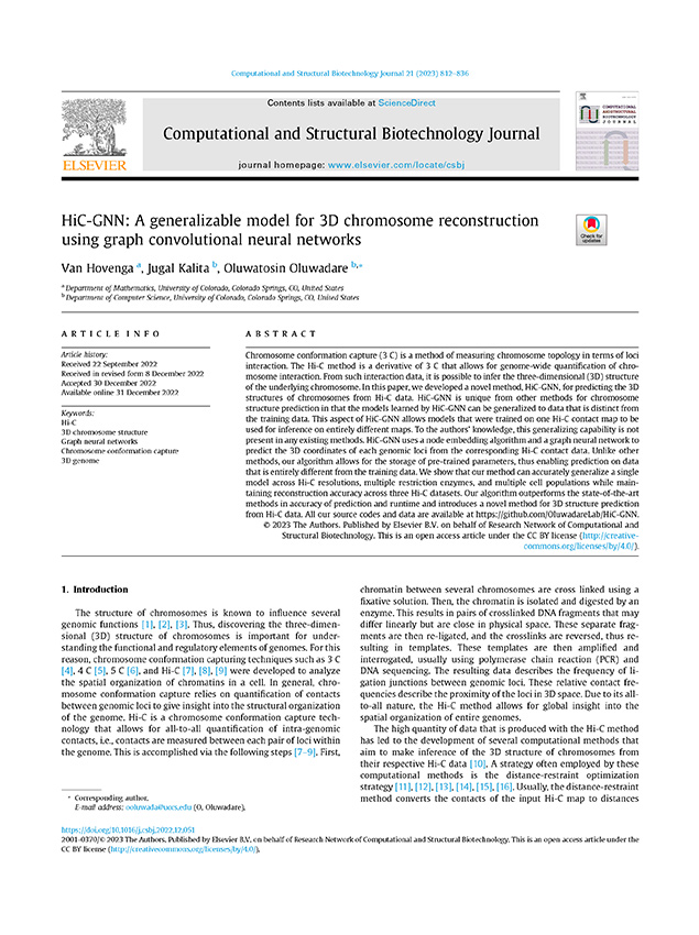 • 2024, Van Hovenga, Jugal Kalita and Oluwatosin Oluwadare(Presenter), International Conference on Research in Computational Molecular Biology (RECOMB2024, “HiC-GNN: A generalizable model for 3D chromosome reconstruction using graph convolutional neural networks” (Conference Poster)