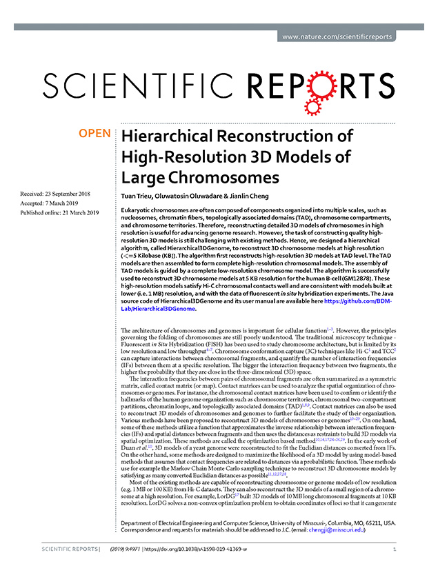1. Trieu, Tuan, Oluwadare, Oluwatosin, and Jianlin Cheng. Hierarchical Reconstruction of High-Resolution 3D Models of Large Chromosome. Scientific reports. 2019 Mar 21;9(1):4971.