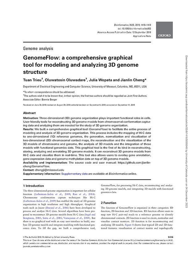 1. Trieu, Tuan*, Oluwadare, Oluwatosin*, Julia Wopata, and Jianlin Cheng. GenomeFlow: A Comprehensive Graphical Tool for Modeling and Analyzing 3D Genome Structure. Bioinformatics (2018). (* Co-first author)