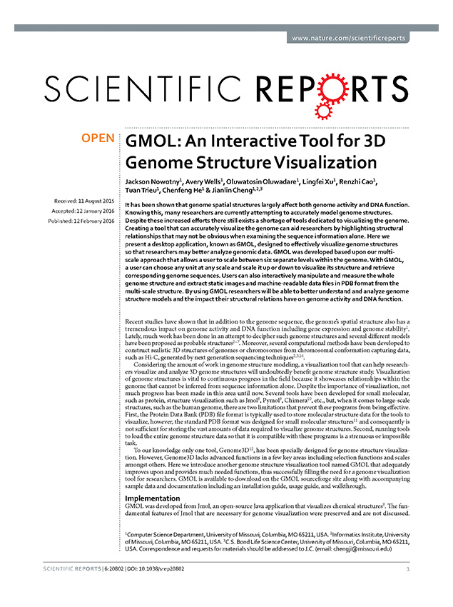 1. J. Nowotny, A. Wells, Oluwadare, O., L. Xu, R. Cao, T. Trieu, C. He, J. Cheng. GMOL: an interactive tool for 3D genome structure visualization. Scientific Reports, accepted, 2016.View Publication    |    Code