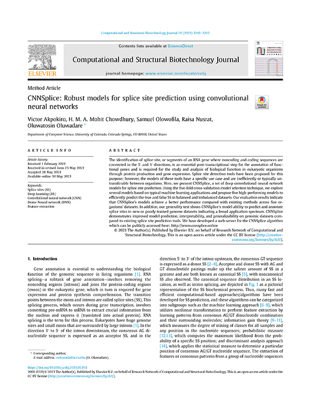 1. Akpokiro, V., Chowdhury, H. M. A., Olowofila, S., Nusrat, R., & Oluwadare, O. (2023). CNNSplice: Robust Models for Splice Site Prediction Using Convolutional Neural Networks. Computational and Structural Biotechnology Journal. ISSN 2001-0370.