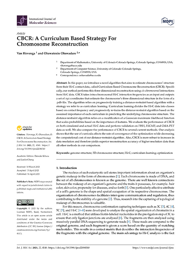 1. Hovenga, Van; Oluwadare, O. (2021) CBCR: A Curriculum Based Strategy For Chromosome Reconstruction Int. J. Mol. Sci. 22, no. 8: 4140.