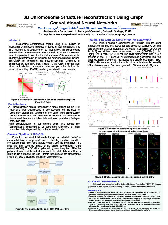 - Hovenga V, Kalita J and Oluwadare O. 3D chromosome structure reconstruction using graph convolutional neural networks [version 1; not peer reviewed]. F1000Research 2022, 11:1419 (poster) (doi: 10.7490/f1000research.1119247.1).