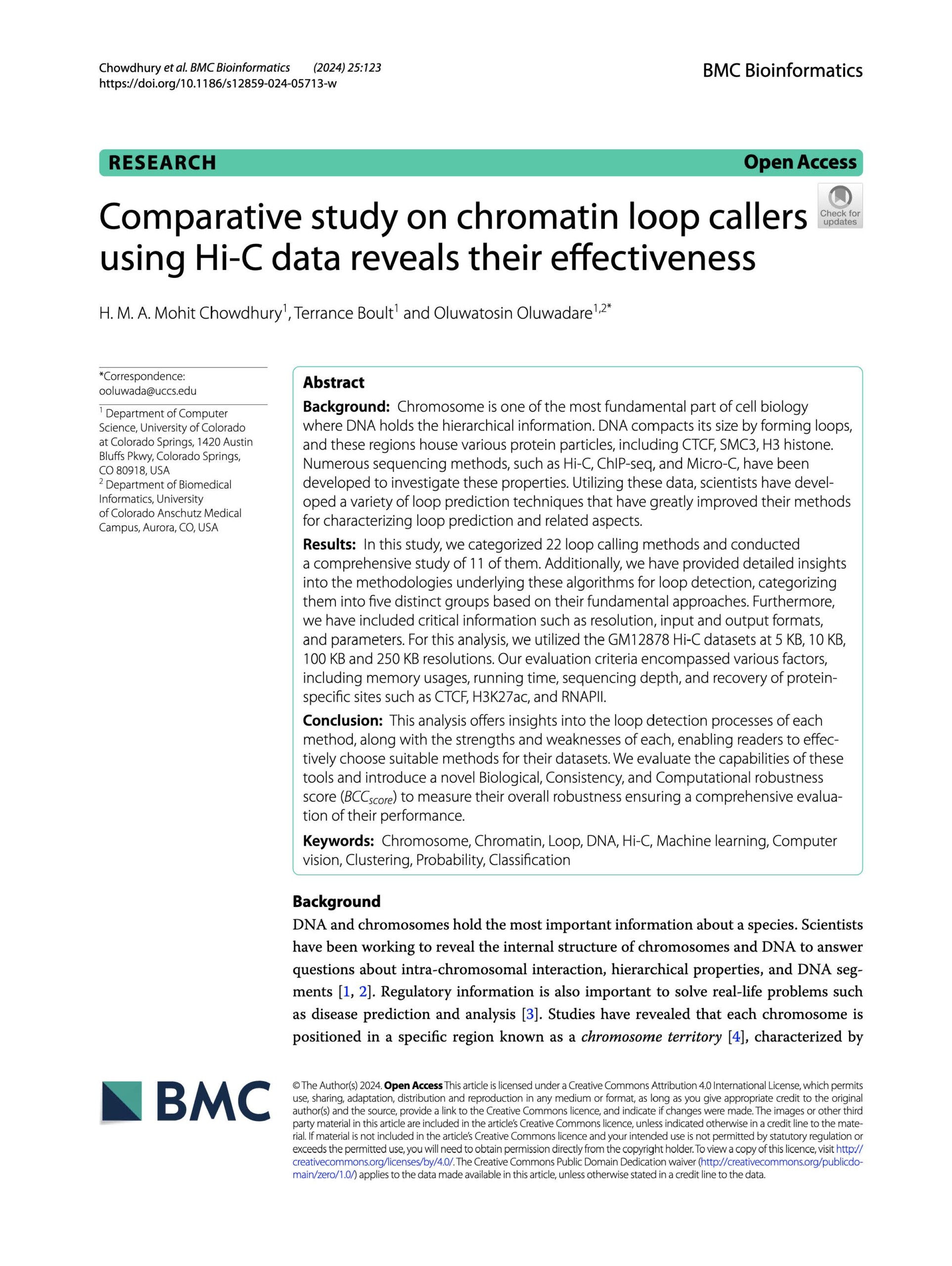 1. Chowdhury, H. M. A. M., Boult, T., & Oluwadare, O. (2024). Comparative study on chromatin loop callers using Hi-C data reveals their effectiveness. BMC Bioinformatics 25, 123 (2024).View Publication    |    GitHub Code