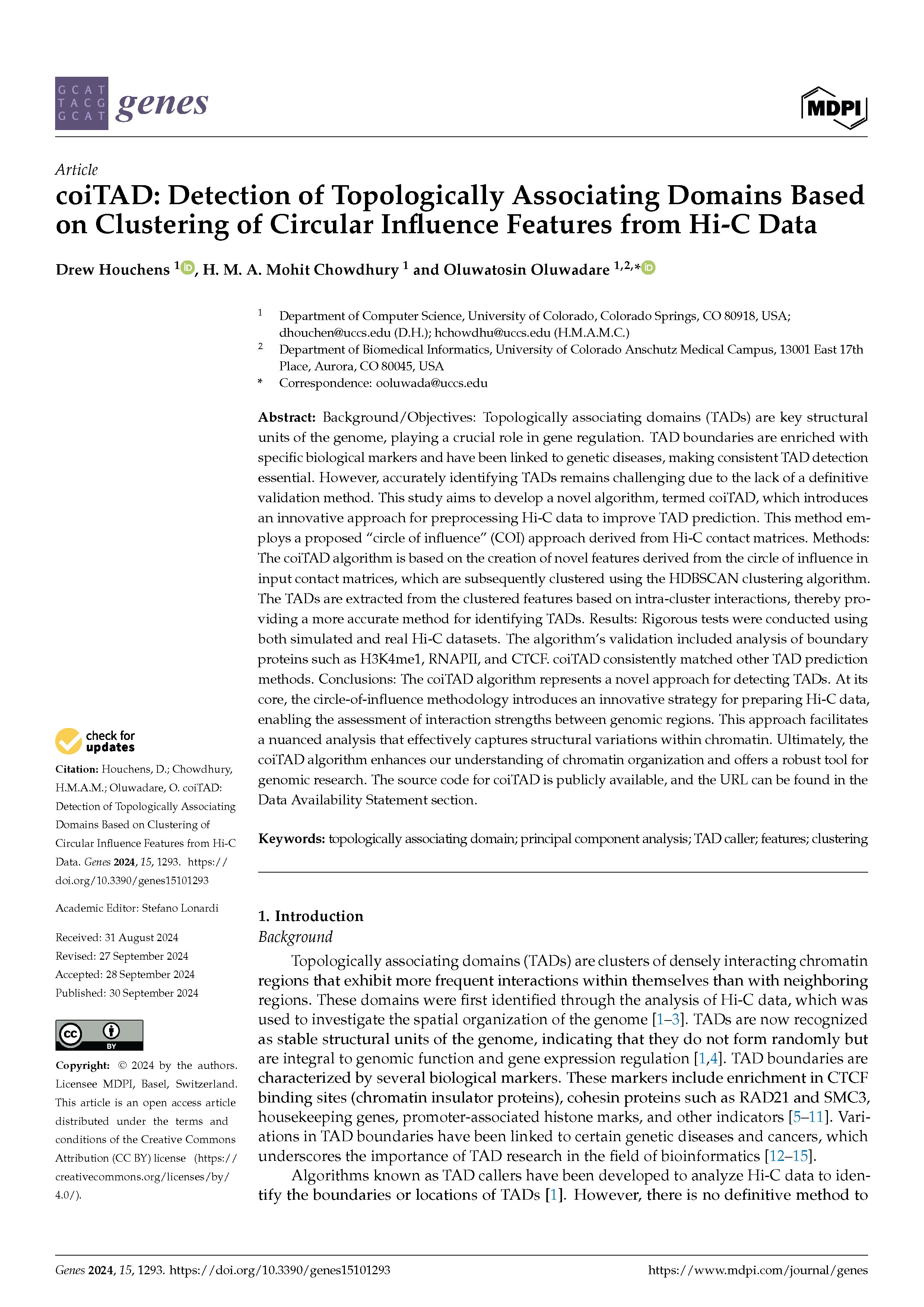 1. Houchens, D.; Chowdhury, H.M.A.M.; & Oluwadare, O. (2024). coiTAD: Detection of Topologically Associating Domains Based on Clustering of Circular Influence Features from Hi-C DataGenes 2024, 15, 1293.