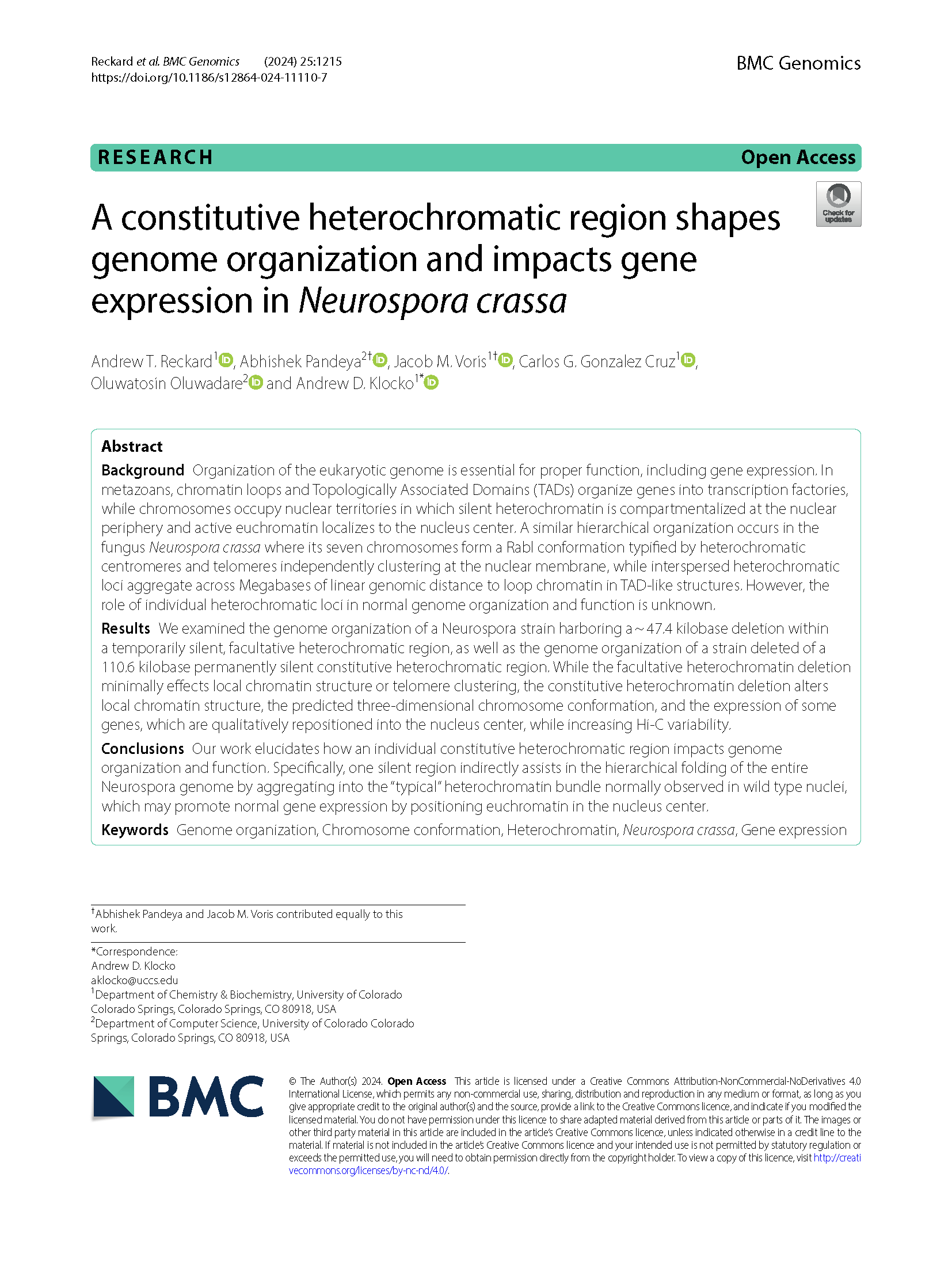 1. Andrew T. Reckard, Abhishek Pandeya, Jacob M. Voris, Carlos G. Gonzalez Cruz, Oluwatosin Oluwadare & Andrew D. Klocko (2024). A constitutive heterochromatic region shapes genome organization and impacts gene expression in Neurospora crassa. BMC Genomics 25, 1215 (2024). https://doi.org/10.1186/s12864-024-11110-7