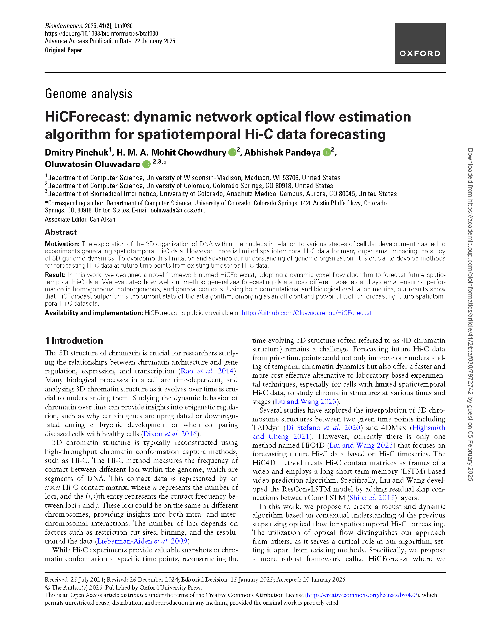 1. Pinchuk, D., Chowdhury, H. M. A. M., Pandeya, A., & Oluwadare, O. (2025). HiCForecast: dynamic network optical flow estimation algorithm for spatiotemporal Hi-C data forecasting. Oxford Bioinformatics journal
