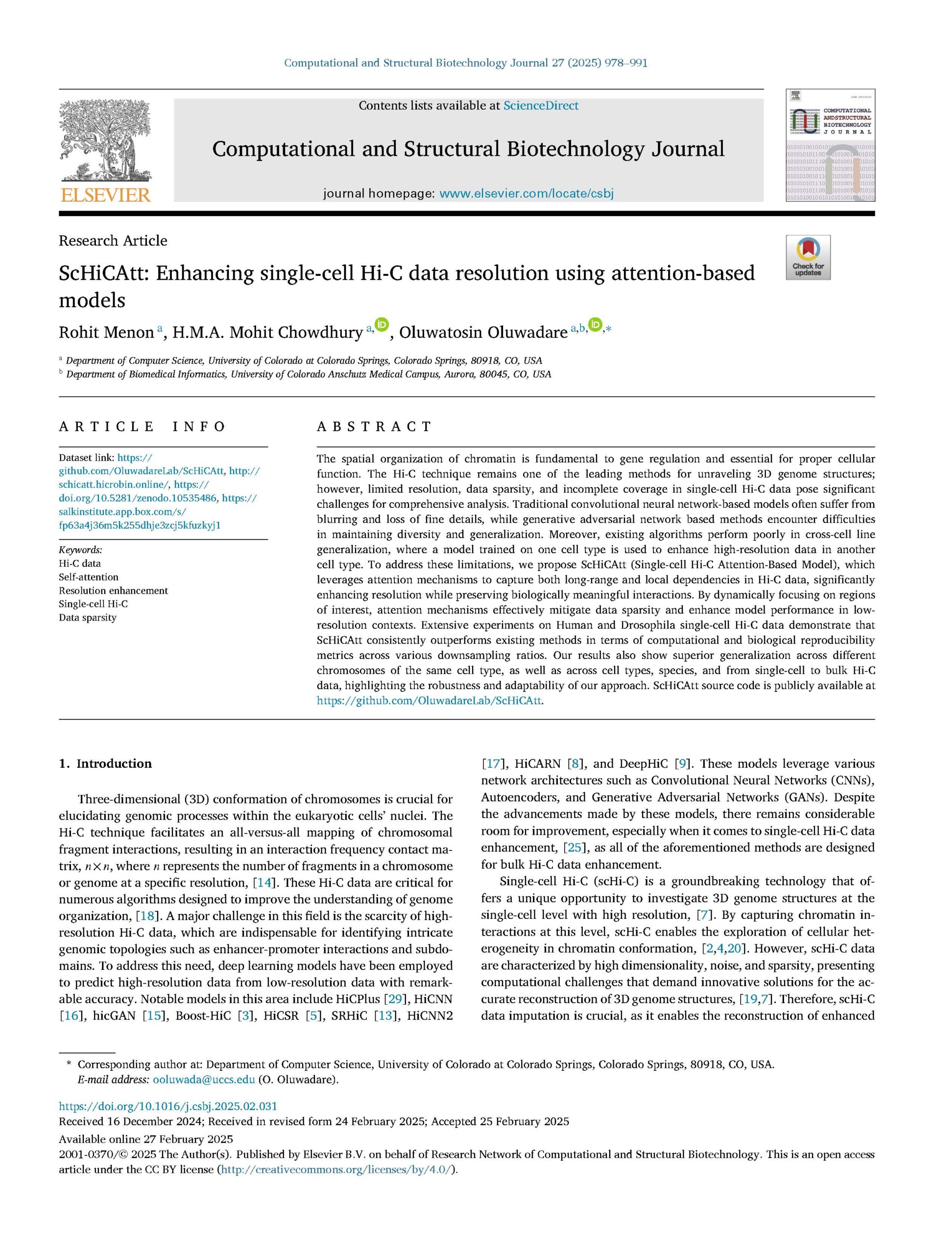 1. Menon, R., Chowdhury, H. M., & Oluwadare, O. (2025). ScHiCAtt: Enhancing Single-Cell Hi-C Data Resolution Using Attention-Based ModelsComputational and Structural Biotechnology Journal.