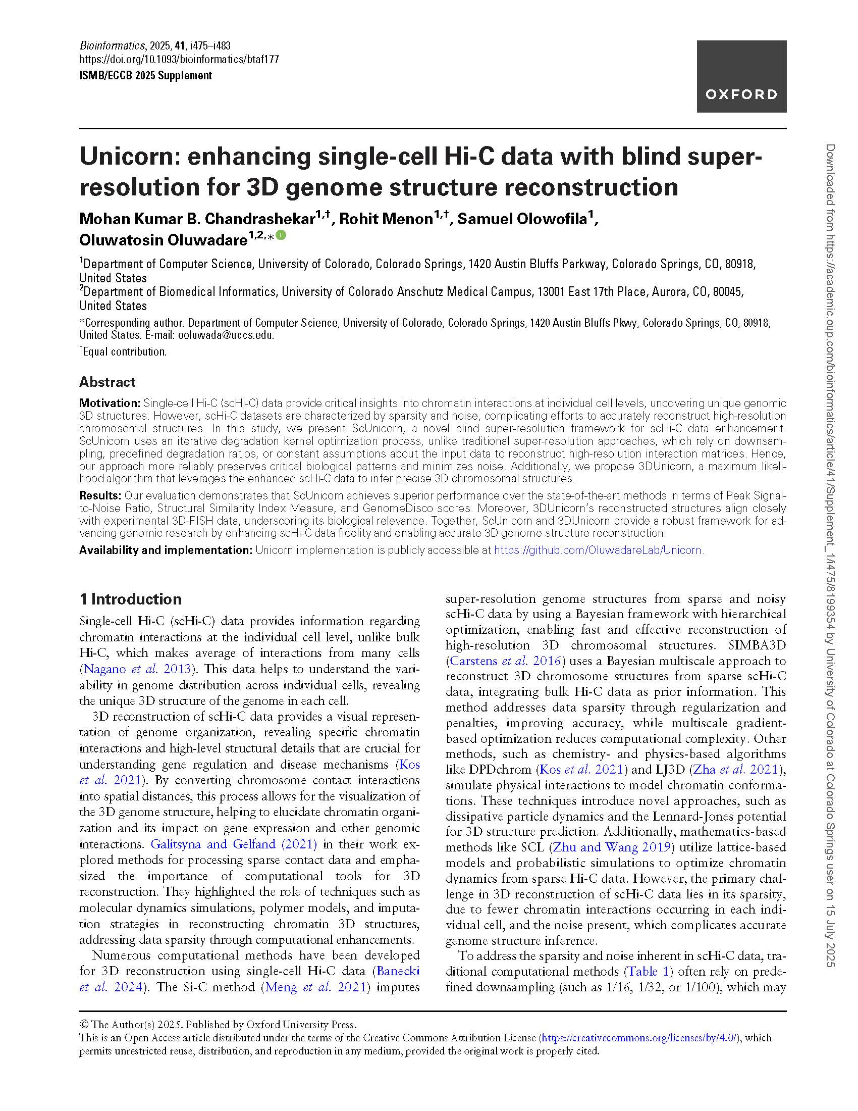 1. Chandrashekar M. K. B., Menon,  R., Olowofila, S., and Oluwadare, O. (2025). Unicorn: Enhancing Single-Cell Hi-C Data with Blind Super-Resolution for 3D Genome Structure Reconstruction. Oxford Bioinformatics journal. Accepted for ISMB/ECCB 2025 Proceedings. (Acceptance rate: ~17.5%)   View Publication    |    GitHub Code