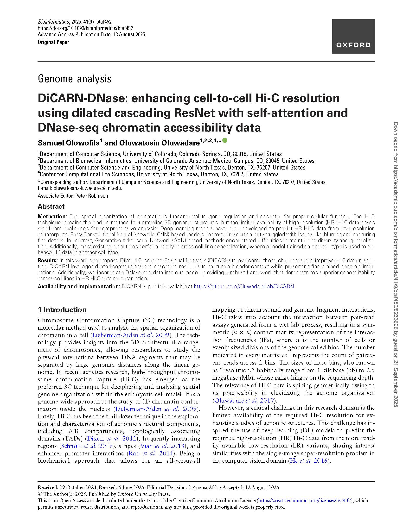 1. Olowofila, S., and Oluwadare, O (2025). DiCARN-DNase: Enhancing Cell-to-Cell Hi-C Resolution Using Dilated Cascading ResNet with Self-Attention and DNase-seq Chromatin Accessibility Data. Oxford Bioinformatics journal. View Publication    |    GitHub Code